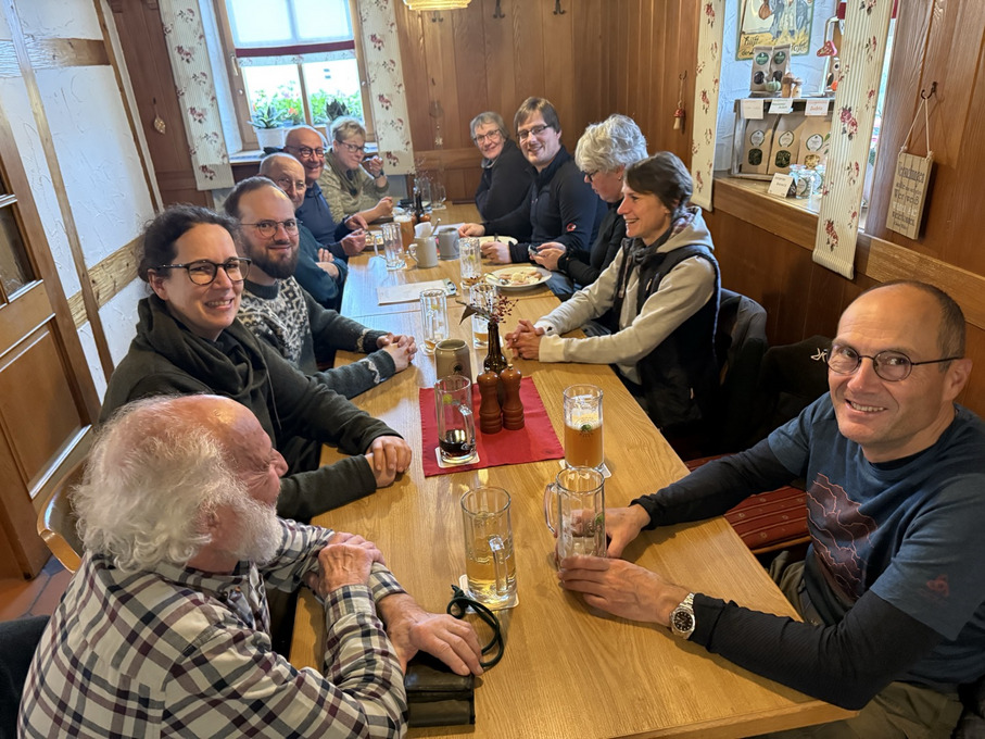 Zur Mittagszeit kehrte die Gruppe in eine fränkische Gaststätte ein, wo regionale Spezialitäten wie Schäuferle vom Schwein, Rehbraten und gebackener Karpfen serviert wurden. Dazu durfte natürlich „a Seidla“ – das klassische halbe Bier – oder wahlweise „a Seidla Samala“ (alkoholfrei) nicht fehlen. Einige gönnten sich zum Abschluss noch frische Apfelküchlein mit Vanilleeis, bevor es – gestärkt und inspiriert – wieder hinaus in den Wald ging.